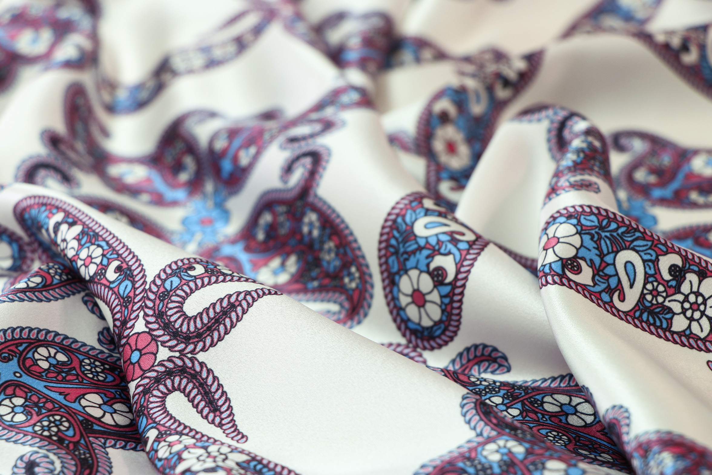 Un imprimé qui met en lumière la beauté du célèbre motif floral Perse, décliné dans des tons bleus et rouges, inspirés des Saris indiens exposés au Musée du Quai Branly à Paris.